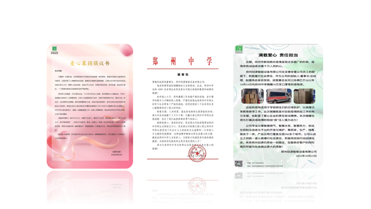 2010年公司成立之初,即向革命老區(qū)---河北省西柏坡華潤(rùn)集團(tuán)承建的紅色希望小鎮(zhèn)捐贈(zèng)無線遠(yuǎn)傳智能燃?xì)獗砑笆殖殖碓O(shè)備、運(yùn)營(yíng)軟件、電腦等價(jià)值40余萬元的軟/硬件裝備。并舉辦愛心募捐活動(dòng)、在抗疫斗爭(zhēng)中積極捐贈(zèng)物資。